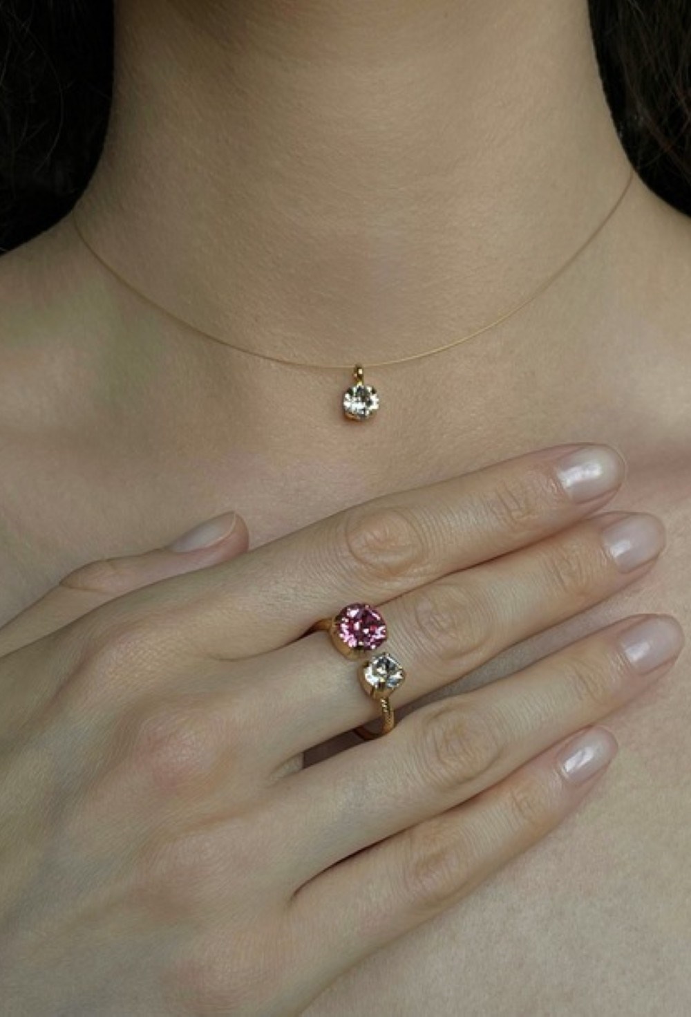 Swarovski crystals, jewelry alloy, gold plating, nylon-coated steel jewelry rope